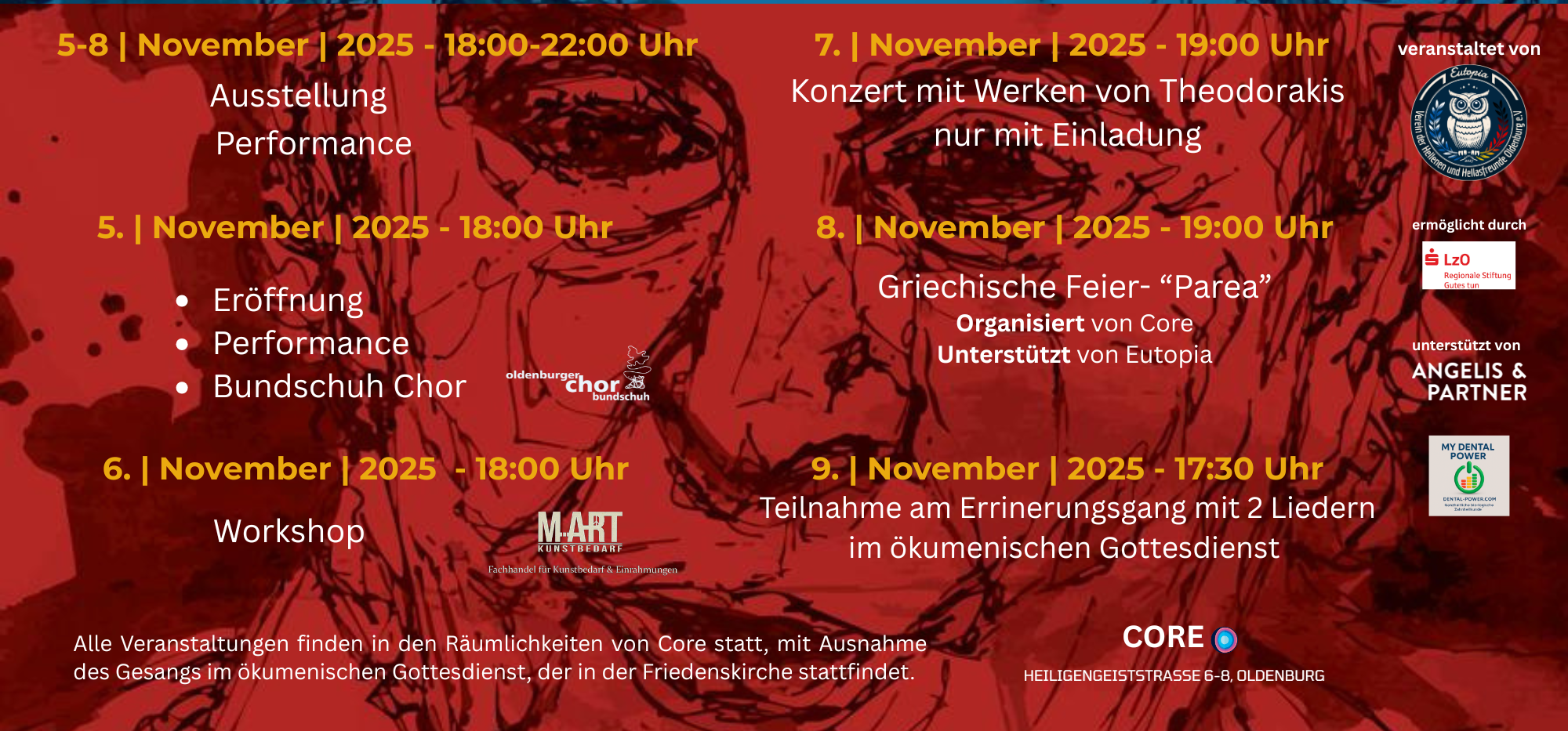 Alle Veranstaltungen finden im gastfreundlichen CORE, Heiligengeiststraße 6–8, statt – in barrierefreien Räumen. Das Konzert wird im Auditorium stattfinden, während die Ausstellung in einem eigens vorbereiteten Raum – ebenfalls im CORE – gezeigt wird. Das CORE beteiligt sich außerdem mit einer eigenen Veranstaltung: Am Samstag, den 8. November, organisiert es ein griechisches Fest mit dem Titel „Parea“. Unser Verein unterstützt das Fest, indem er kocht und mit unseren Musikern einen Teil des Musikprogramms gestaltet. Ein großer Dank geht an Thanasis Vasileiou und sein Team, das das Essen für die Feier zubereiten wird – die Namen des Teams werden noch bekannt gegeben.